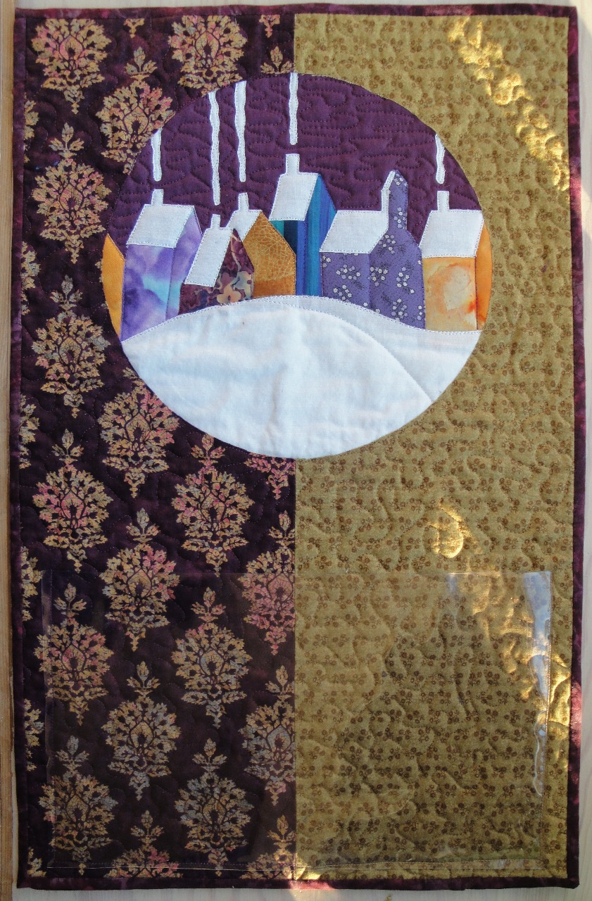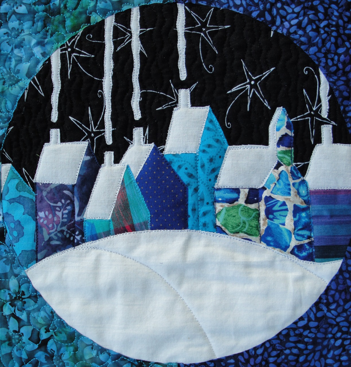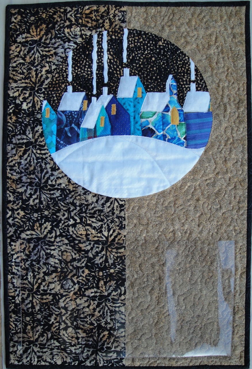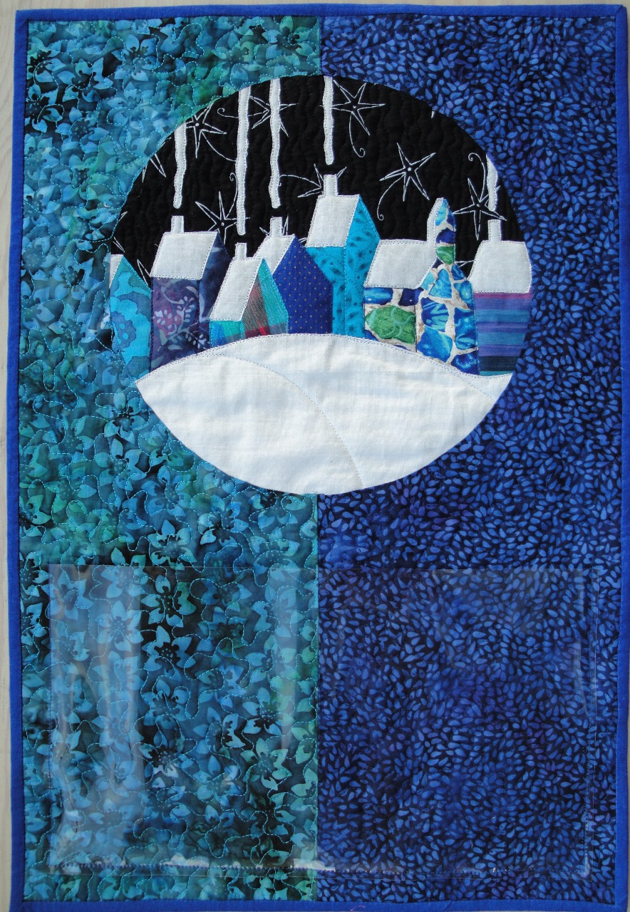 Vi bygger opp motivet trinn for trinn med vliesofix og applikasjon, og setter det inn i en ramme. Du bruker dine egne stoffer i de fargene og mønstrene du ønsker, så byen kan henge framme hele året, ikke bare til jul.